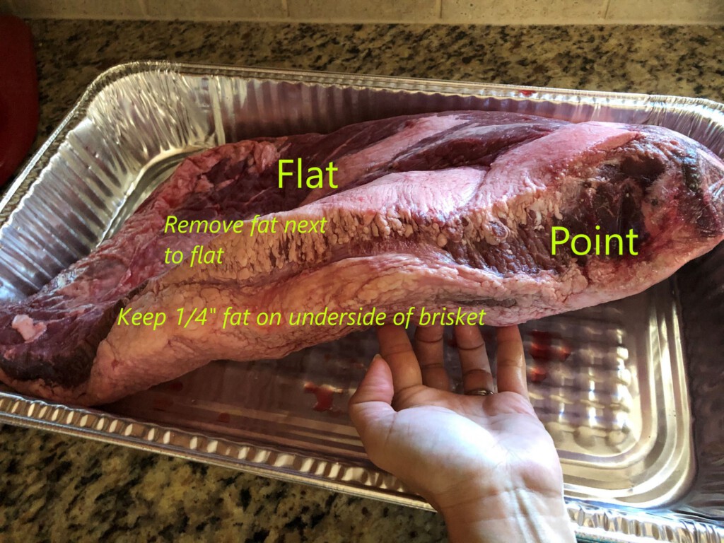 - On the fat side, filet the fat (likely under the point) to reduce the fat to about 1/4″